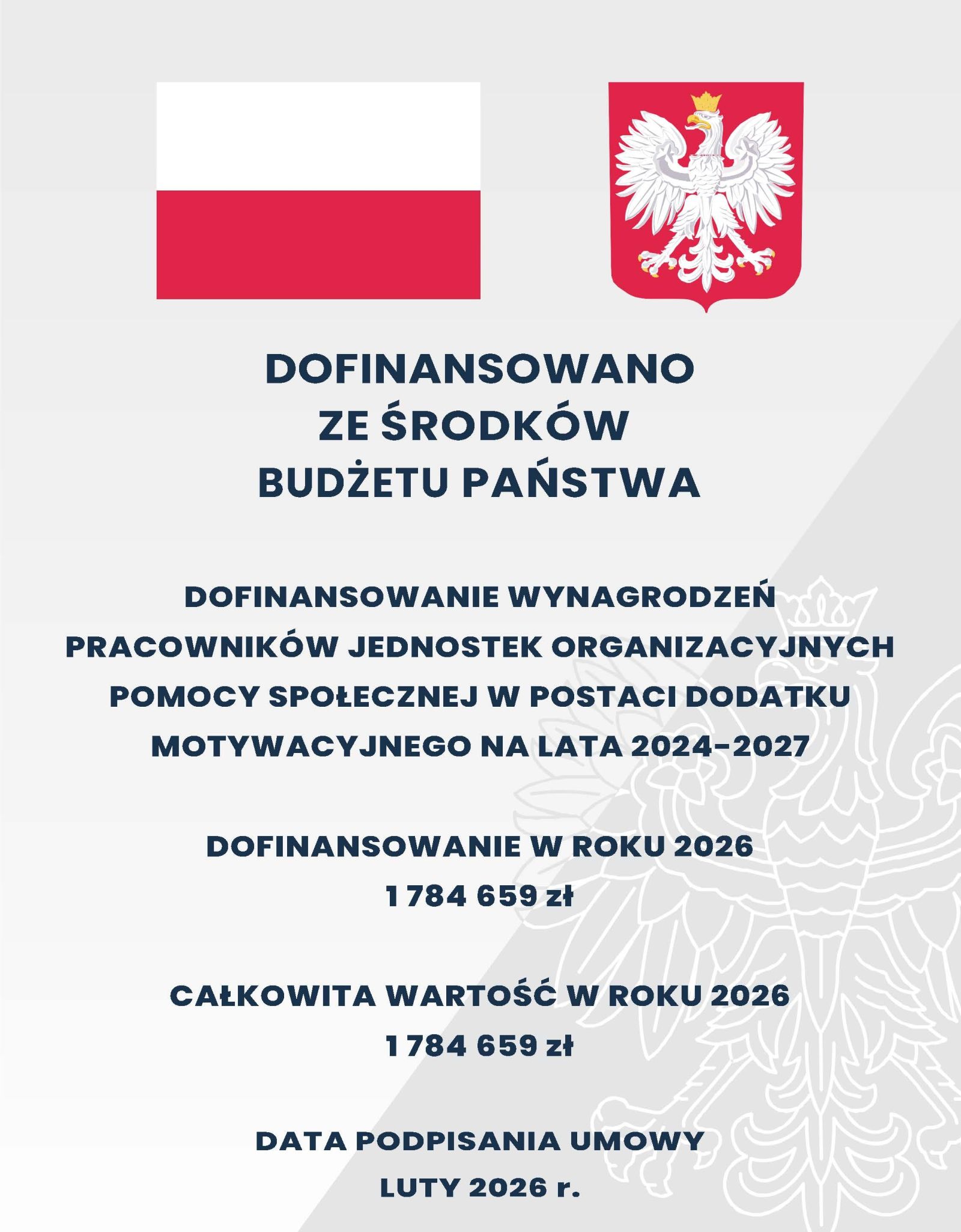 17 lutego 2026 r. Powiat Toruński podpisał z Wojewodą Kujawsko-Pomorskim Umowę Nr 18/2026 o udzielenie dotacji na dofinansowanie wynagrodzeń pracowników jednostek organizacyjnych pomocy społecznej w postaci dodatku motywacyjnego na 2026 r. z rządowego Programu „Dofinansowanie wynagrodzeń pracowników jednostek organizacyjnych pomocy społecznej w postaci dodatku motywacyjnego na lata 2024-2027”.