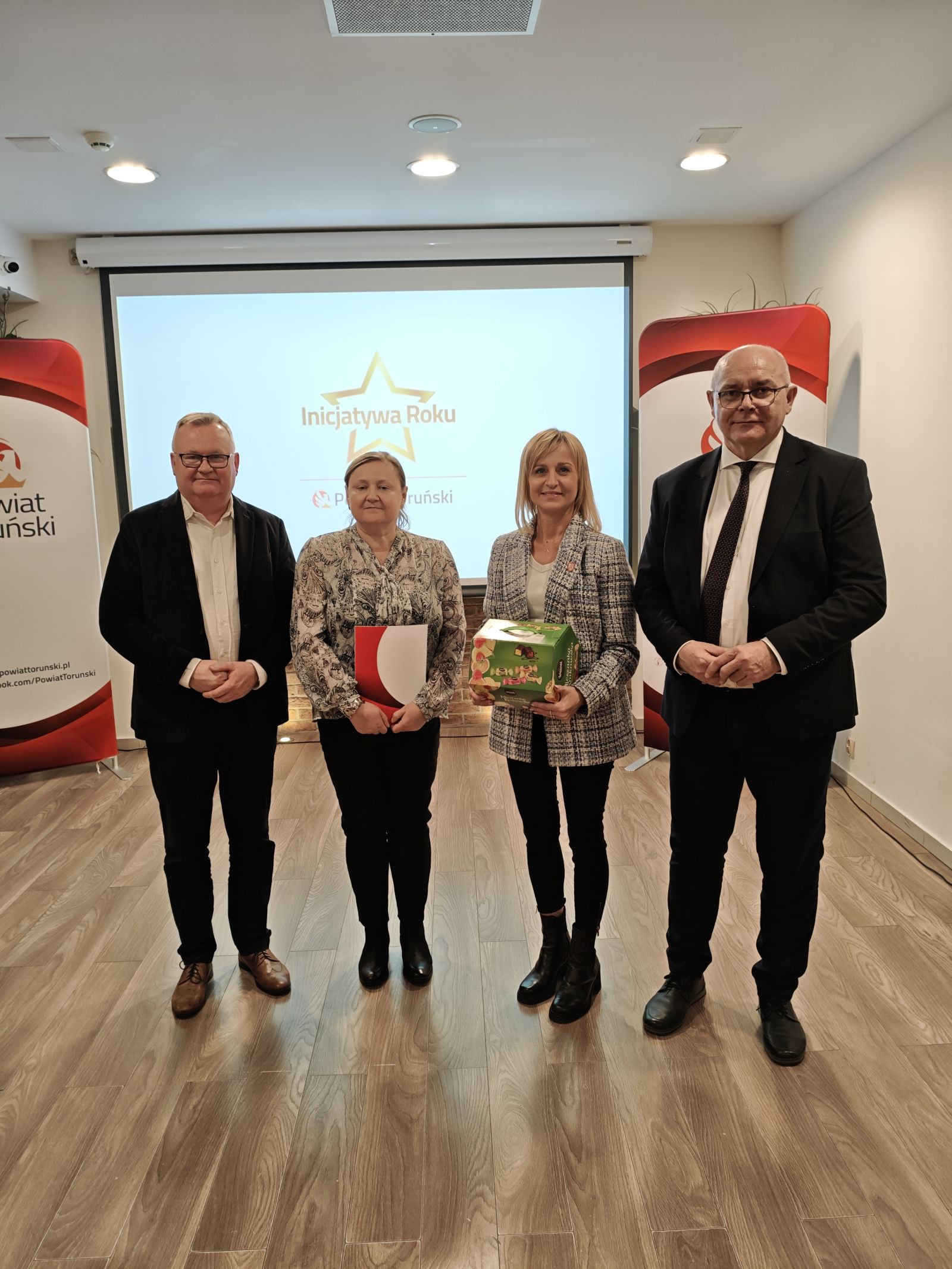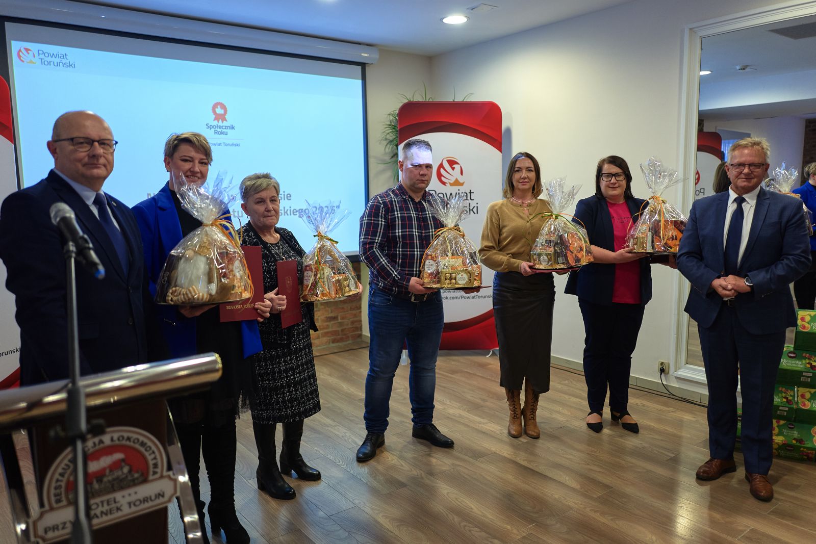 • na zdjęciu widoczne są upominki i gratulacje dla uczestników konkursu Społecznik Roku Powiatu Toruńskiego 2025