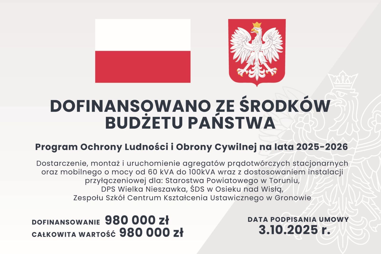 W dniu 03.10.2025 r. Powiat Toruński podpisał z Wojewodą Kujawsko – Pomorskim Umowę nr 83/OLiOC/WBZK/2025 o udzielenie finansowania ze środków pochodzących z Programu Ochrony Ludności i Obrony Cywilnej na lata 2025-2026 środki finansowe na zadanie: Dostarczenie, montaż i uruchomienie agregatów prądotwórczych stacjonarnych oraz mobilnego o mocy od 60 kVA do 100kVA wraz z dostosowaniem instalacji przyłączeniowej dla: Starostwa Powiatowego w Toruniu, DPS Wielka Nieszawka, ŚDS w Osieku nad Wisłą, Zespołu Szkół Centrum Kształcenia Ustawicznego w Gronowie.