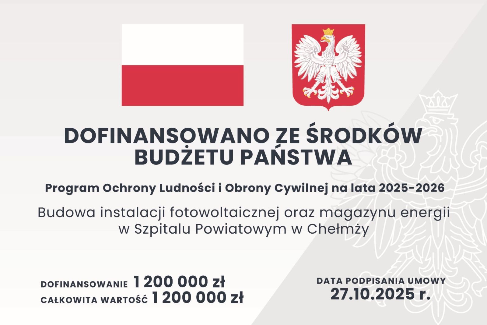 W dniu 27.10.2025 r. Powiat Toruński podpisał z Wojewodą Kujawsko – Pomorskim Umowę nr 189/OLiOC/WBZK/2025 o udzielenie finansowania ze środków pochodzących z Programu Ochrony Ludności i Obrony Cywilnej na lata 2025-2026 środki finansowe na zadanie: Budowa instalacji fotowoltaicznej oraz magazynu energii w Szpitalu Powiatowym w Chełmży.