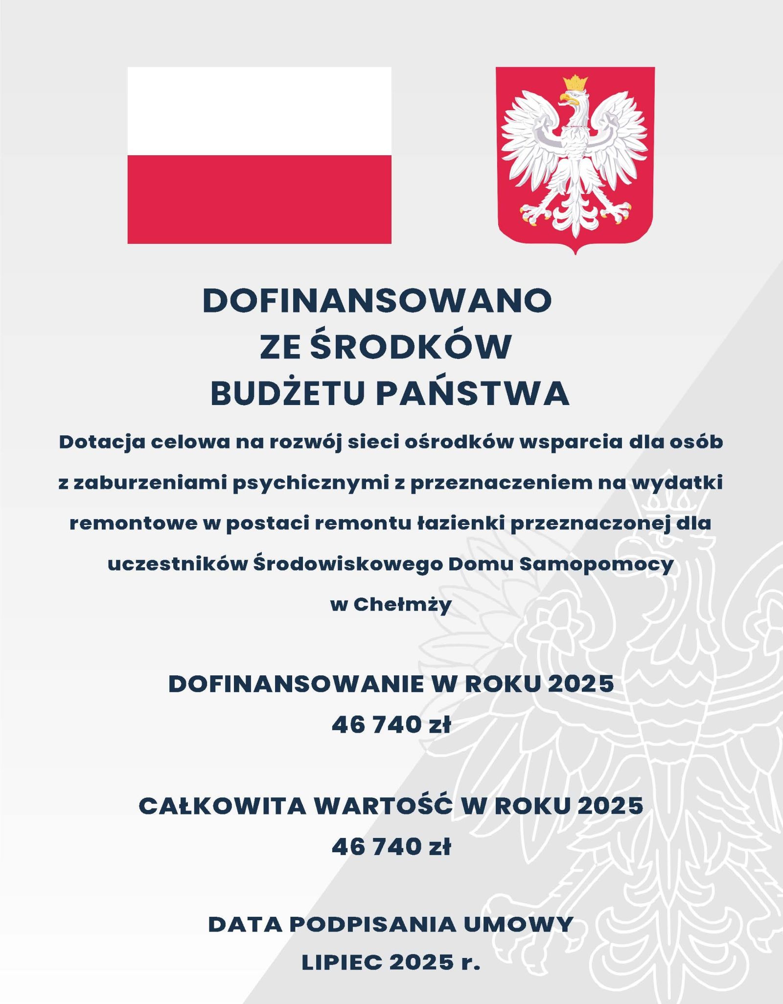 Dnia 22 lipca 2025 roku Zarząd Powiat Toruńskiego podpisał z Wojewodą Kujawsko-Pomorskim Umowę Nr 10/2025, na mocy której otrzymał dotację celową z budżetu państwa w wysokości 46 740 zł na realizację zadania mającego na celu rozwój sieci ośrodków wsparcia dla osób z zaburzeniami psychicznymi. Środki te przeznaczone zostaną na remont łazienki w Środowiskowym Domu Samopomocy w Chełmży.Nowe brzmienie Szkoły Muzycznej w Chełmży!