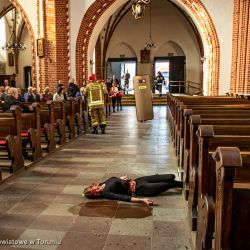 Przedstawiciele ćwiczących jednostek zebrali się Chełmży, gdzie służby mundurowe ćwiczyły postępowanie w przypadku ataku terrorystycznego na obiekt sakralny. Akcja odbyła się w Konkatedrze św. Trójcy w Chełmży. Scenariusz przewidywał wybuch przygotowanego chałupniczą metodą ładunku wybuchowego tzw. brudnego (powodującego dodatkowo skażenie np. substancjami niebezpiecznymi dla zdrowia i życia) w czasie nabożeństwa. Grupa młodzieży ze szkolnego koła PCK LO w Chełmży oraz SP w Kończewicach zapewniła grupę pozoracji i symulowała rannych oraz poszkodowanych. Na miejsce przybyły powiadomione o zdarzeniu straż pożarna i policja. Obserwatorzy śledzili omawiany na bieżąco przez specjalistów przebieg akcji ratunkowej: ewakuację ofiar, zabezpieczanie terenu, pracę psów wykrywających materiały wybuchowe, procedury pobierania próbek itp. Osoby ranne i poszkodowane zostały przetransportowane do zorganizowanego Punktu Zabiegów Sanitarnych (PZSan) w chełmżyńskim Ośrodku Sportu i Turystyki. Tam – zgodnie z procedurami – przechodziły zabiegi oczyszczania, odkażania, korzystały z łaźni, zmieniały ubrania na czyste i podlegały kontroli dozymetrycznej. Zebrani obejrzeli prezentację objaśniającą zasady rozwijania i funkcjonowania punktów PZSan.