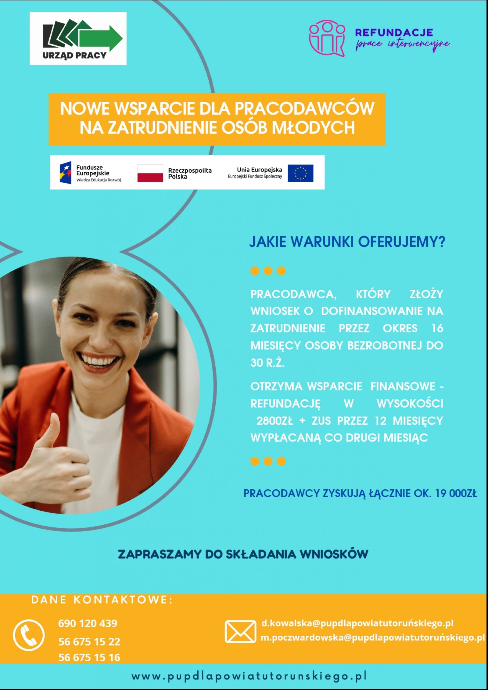 Prace interwencyjne realizowane w ramach naboru finansowane będą ze środków Unii Europejskiej w ramach Europejskiego Funduszu Społecznego - Program Operacyjny Wiedza Edukacja Rozwój, Oś priorytetowa I Rynek pracy otwarty dla wszystkich, Działanie 1.2 Wsparcie osób młodych na regionalnym rynku pracy, Poddziałanie 1.2.1 Wsparcie udzielane z Europejskiego Funduszu Społecznego, w związku z realizacją projektu „Aktywni w powiecie toruńskim".