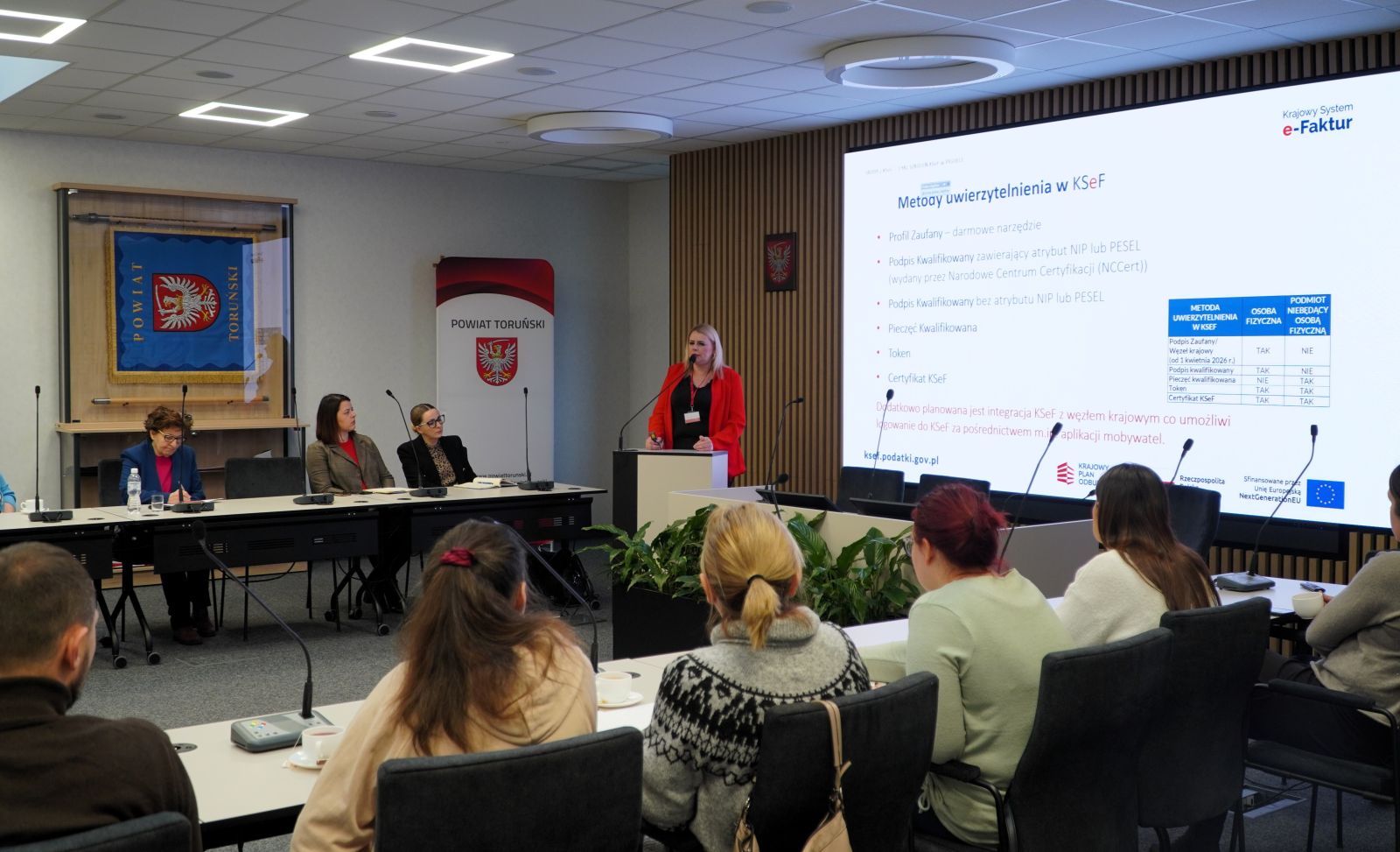 Dzisiaj, 6 lutego 2026 roku, w Starostwie Powiatowym w Toruniu, odbyło się pierwsze z dwóch zaplanowanych szkoleń pt. „Krajowy System e-Faktur – nowy obowiązek”, organizowane przez Powiatowy Zespół Doradztwa Rolniczego w Toruniu z siedzibą w Chełmży, we współpracy z Drugim Urzędem Skarbowym w Toruniu oraz Starostwem Powiatowym w Toruniu.