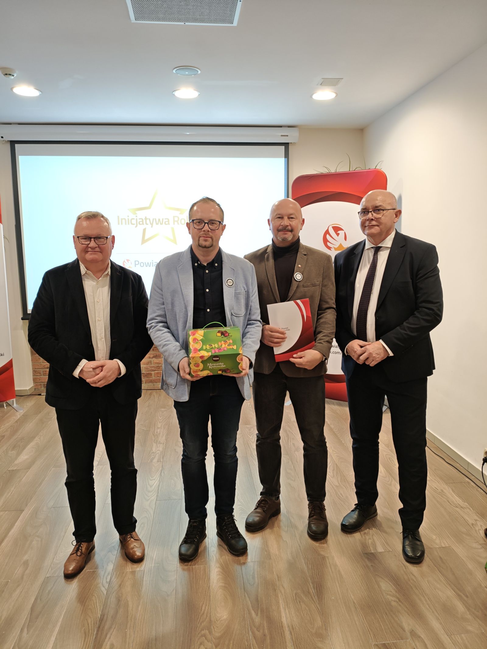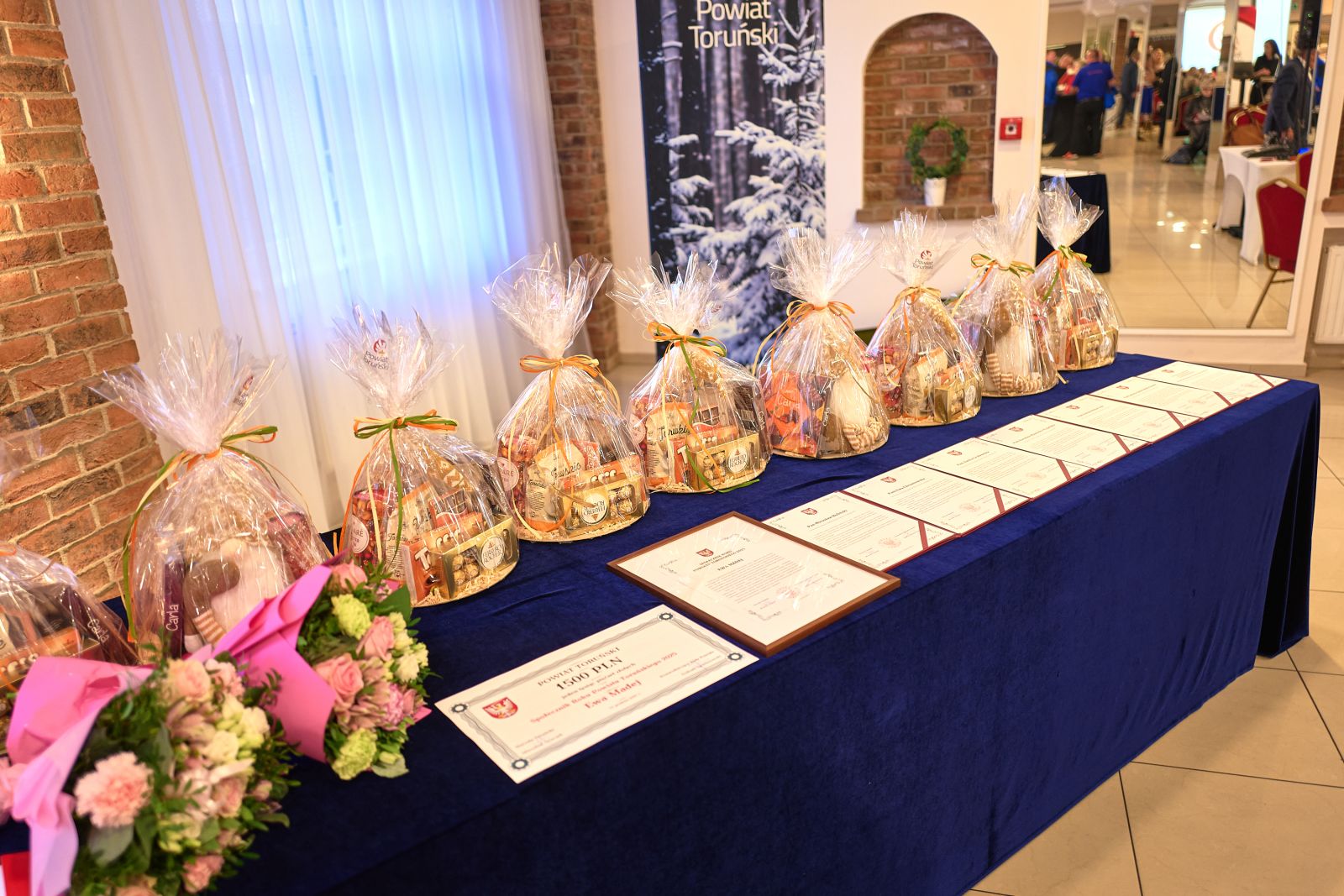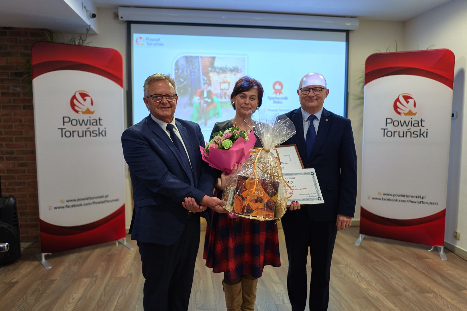 • na zdjęciu widoczne są upominki i gratulacje dla uczestników konkursu Społecznik Roku Powiatu Toruńskiego 2025