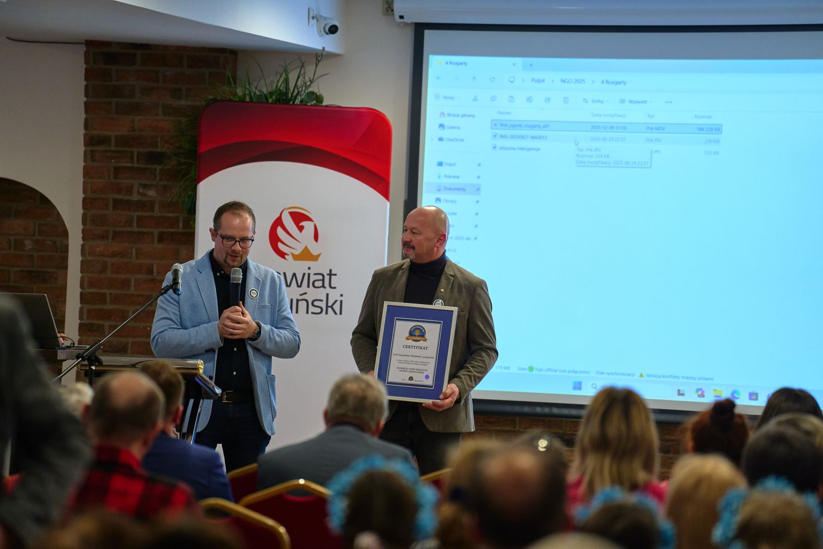 W drugiej części spotkania przeprowadzono konkurs na „Najciekawszą Inicjatywę Społeczną”, który od początku budził pozytywne emocje wśród uczestników Forum. To właśnie oni, w drodze tajnego głosowania, zdecydowali o tym, który projekt zasłuży na tegoroczne wyróżnienie. Autorzy inicjatyw mieli zaledwie cztery minuty, aby zaprezentować swoje pomysły i przekonać publiczność do ich wyjątkowości. Na zwycięzcę czekał bon o wartości 1 000 złotych, natomiast dla wyróżnionych przygotowano bony o wartości 500 złotych. Cały konkurs przebiegał w atmosferze zdrowej rywalizacji, a krótkie, dynamiczne prezentacje pokazały, jak wiele ciekawych działań realizują organizacje i grupy społeczne w naszym powiecie.