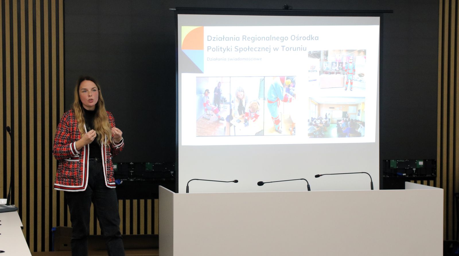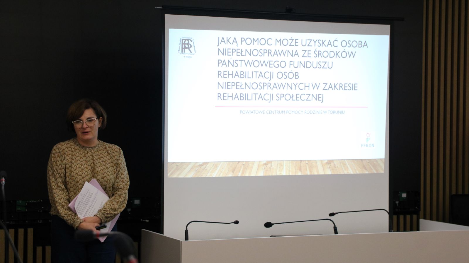 Powiatowe Centrum Pomocy Rodzinie w Toruniu reprezentowały Małgorzata Marmurowicz - Wicedyrektor oraz Alicja Borczyńska, która wskazała możliwości uzyskania wsparcia dla osób niepełnosprawnych ze środków Państwowego Funduszu Rehabilitacji Osób Niepełnosprawnych w zakresie rehabilitacji społecznej. Szczegółowo przedstawiła m.in. możliwości wsparcia w likwidacji barier architektonicznych, likwidacji barier w komunikowaniu się, likwidacji barier technicznych, zakupu sprzętu rehabilitacyjnego czy zakupu przedmiotów ortopedycznych i środków pomocniczych.
