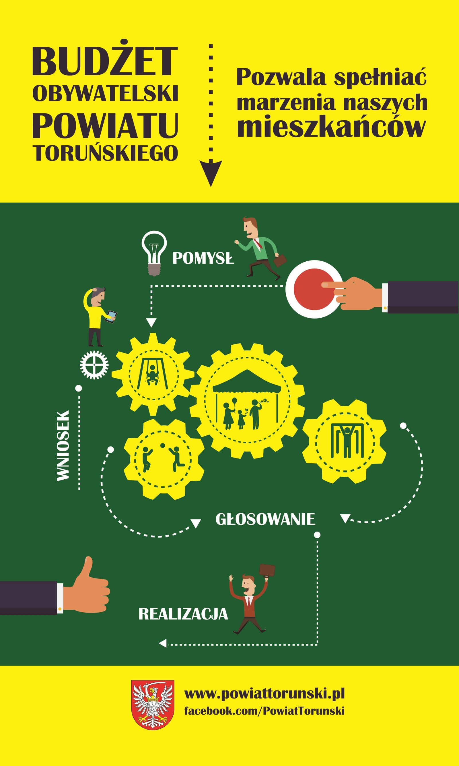 Masz ciekawy pomysł na co wydać publiczne pieniądze, by dobrze służyły mieszkańcom naszego powiatu? Nie czekaj i już dziś zgłoś go w 4. edycji Budżetu obywatelskiego powiatu toruńskiego 2020. Po rocznej przerwie startujemy z nową energią i liczymy na kolejne świetne pomysły naszych mieszkańców. Rozpoczęcie przygody z budżetem obywatelskim jest niezwykle proste: wystarczy mieć dobry pomysł, ciekawie go opisać, zebrać poparcie i złożyć wniosek. Na wnioski czekamy od 15 lipca do 31 lipca 2019 r. Zainteresowanym możliwością skorzystania z tej formy sfinansowania planowanych działań podpowiadamy jak skorzystać z budżetu obywatelskiego powiatu toruńskiego.