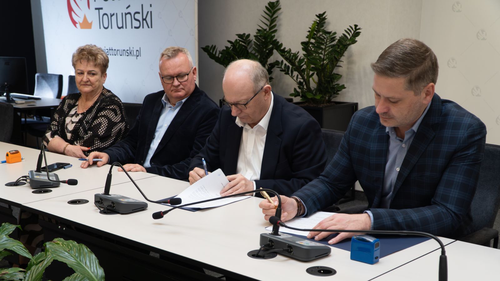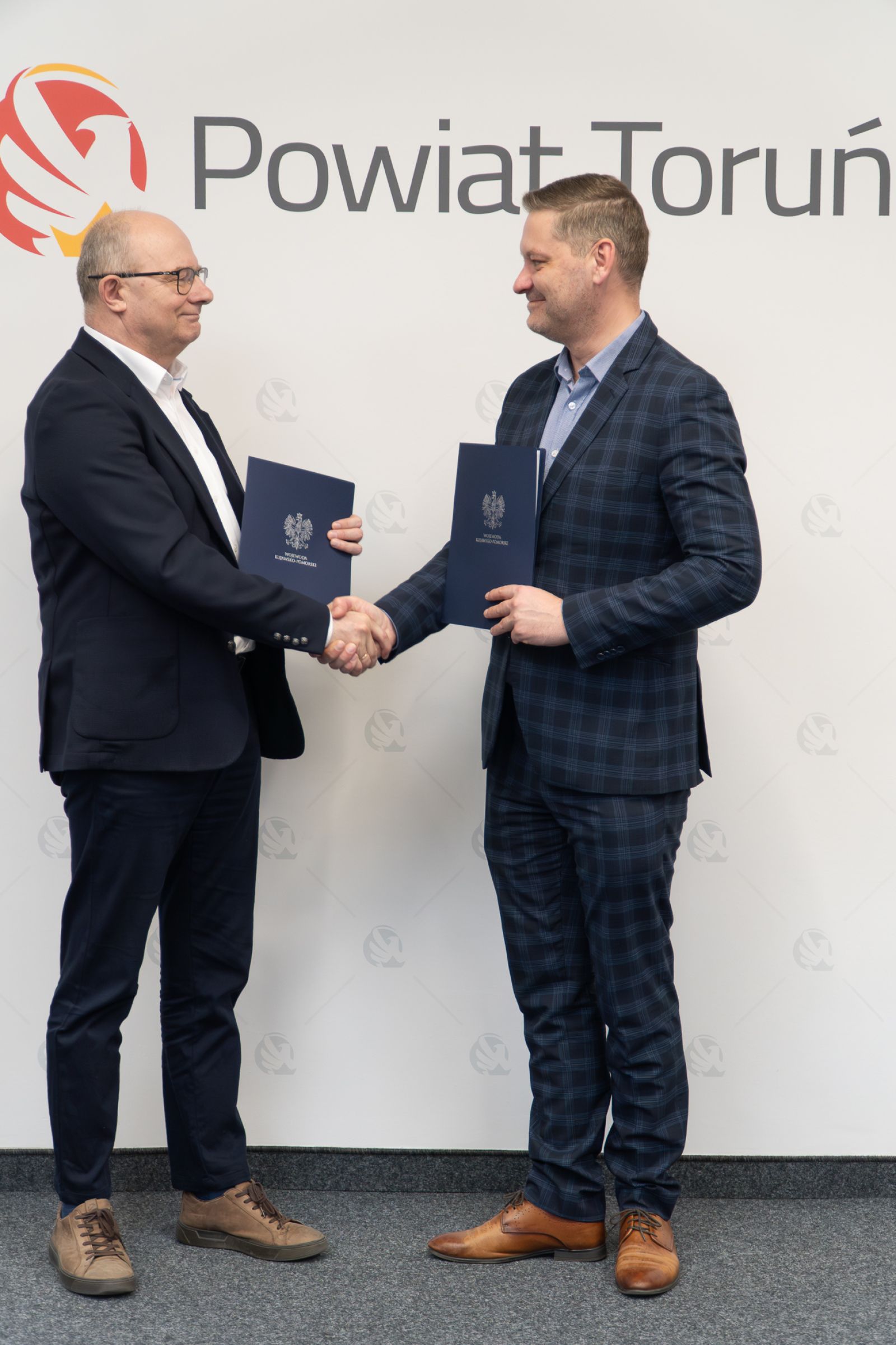 Inwestycje drogowe w Powiecie Toruńskim nie zwalniają tempa. Dzisiaj w Starostwie Powiatowym gościliśmy Wicewojewodę Kujawsko-Pomorskiego Michała Koniucha, który wspólnie ze Starostą Toruńskim Mirosławem Graczykiem, Wicestarostą Tomaszem Zakrzewskim i skarbnikiem powiatu Danutą Jabłońską-Drążelą sfinalizował formalności dotyczące dofinansowania rozbudowy drogi powiatowej nr 2022C. W wydarzeniu uczestniczyłi również członkowie Zarządu Powiatu Agnieszka Janiaczyk-Dąbrowska i Mirosław Nawrotek.