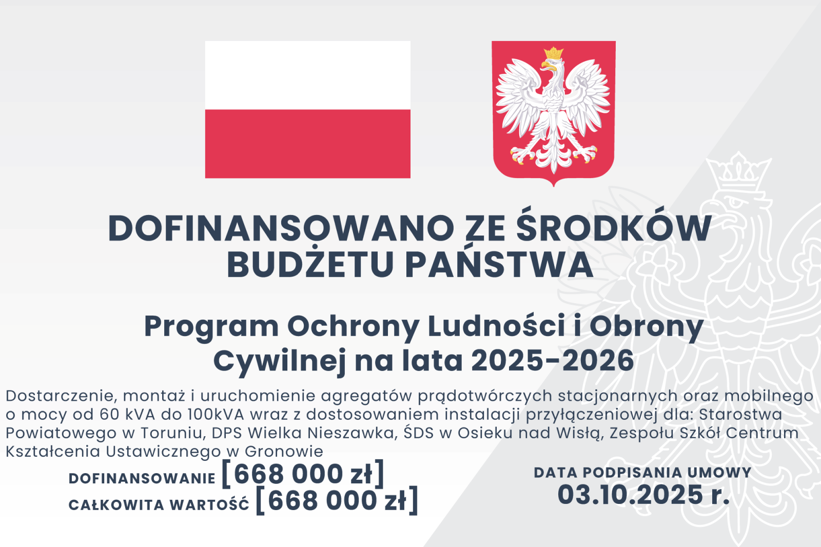 W dniu 03.10.2025 r. Powiat Toruński podpisał z Wojewodą Kujawsko – Pomorskim Umowę nr 83/OLiOC/WBZK/2025 o udzielenie finansowania ze środków pochodzących z Programu Ochrony Ludności i Obrony Cywilnej na lata 2025-2026 środki finansowe na zadanie: