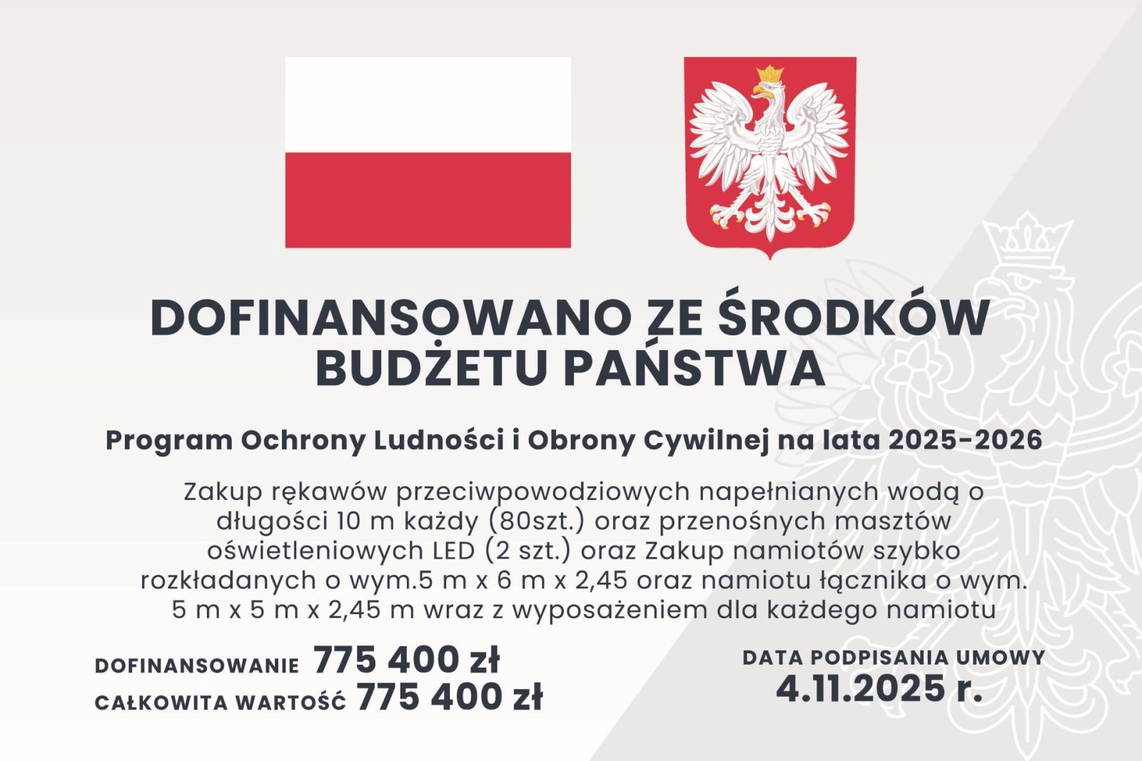 W dniu 4.11.2025 r. Powiat Toruński podpisał z Wojewodą Kujawsko – Pomorskim Umowę nr 214/OLiOC/WBZK/2025 o udzielenie finansowania ze środków pochodzących z Programu Ochrony Ludności i Obrony Cywilnej na lata 2025-2026 środki finansowe na zadanie: Zakup rękawów przeciwpowodziowych napełnianych wodą o długości 10 m każdy (80szt.) oraz przenośnych masztów oświetleniowych LED (2 szt.) oraz Zakup namiotów szybko rozkładanych o wym.5 m x 6 m x 2,45 oraz namiotu łącznika owym. 5 m x 5 m x 2,45 m wraz z wyposażeniem dla każdego namiotu